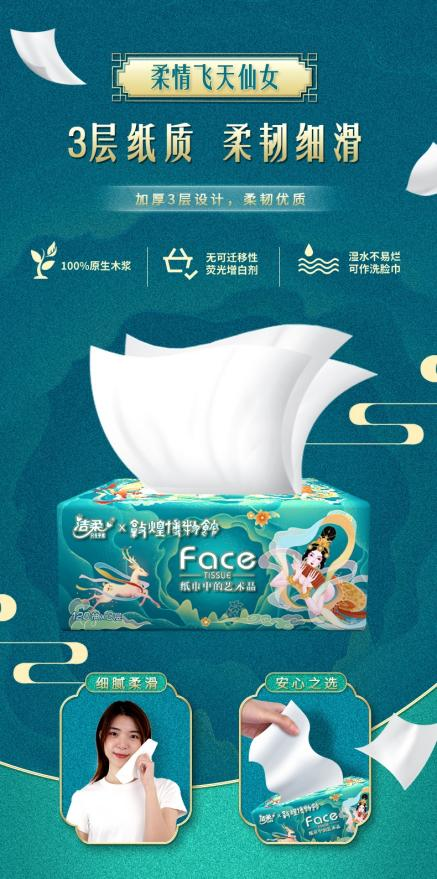 随着近几年市场发展和消费升级,新时代人群尤其是女性群体,逐渐在产品品质和精神需求寻找新的平衡。她们在满足基本需求的同时,更愿意为个性化的商品买单,生活用纸这样的刚需消费领域同样也不例外。在这种新的消费趋势下,洁柔联合敦煌博物馆推出了全新的Face系列联名纸巾,并联合京东平台在3月17日大牌秒杀日首发亮相,顺着兼顾传统文化和现代审美相结合的新风尚,将生活用纸品牌联名推向新的发展高潮。