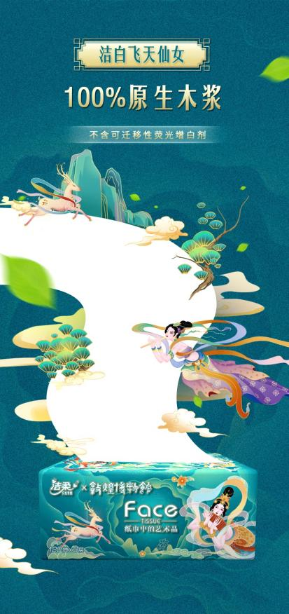 千百年来,敦煌文化一直以神秘崇高的独特美学与异域风情,令无数人心神向往。为了能在产品中带来更多的文化内涵和精神理念,洁柔本次与敦煌博物馆的联动选取了最具代表性的“伎乐天”、“鹿王本生”等元素形象,结合现代艺术和工艺,传递敦煌壁画的独特风采。通过丰富独特的艺术创意,将敦煌之美全方位延伸带领消费者们穿越千年,梦回敦煌,见证其经久不衰的魅力。