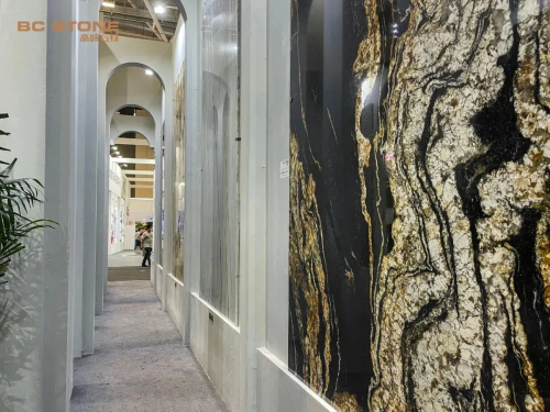 展会现场用人造石搭建而成的“魔方”,既是休憩石凳,又是石艺秀场,新颖别致吸人眼球。用岩板制作的战士铠甲,以创意设计赋予石材新的生命力。