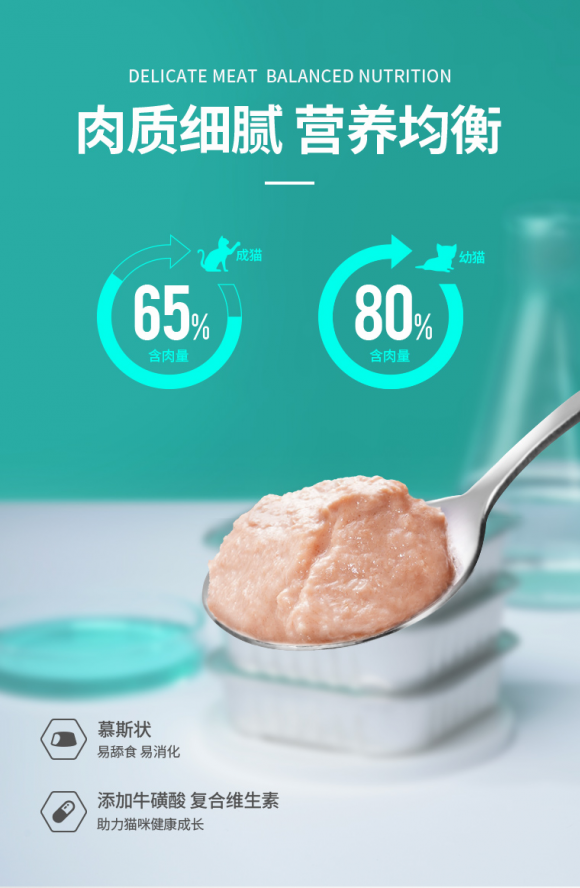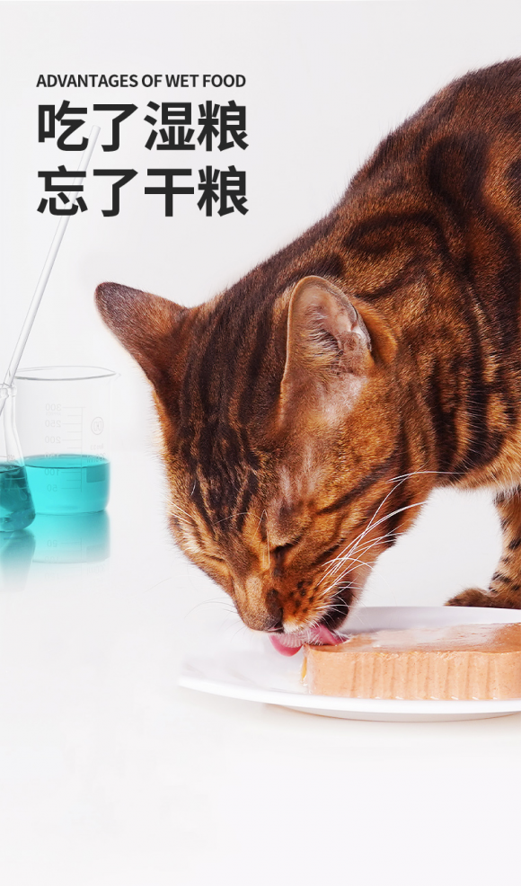 拿罐头给猫咪补水是我们的惯用手段,因为罐头更符合猫咪舔食的天性。这款湿粮中的水分含量为80%,可以很好满足猫咪的水分需求,弥补干粮在这方面的缺陷。