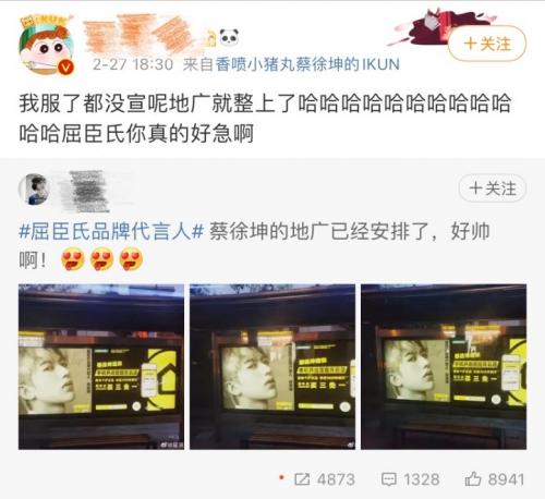 虽是与拥有顶流粉丝圈和超级流量的蔡徐坤携手,但屈臣氏一点都不傲娇不高冷,反倒是心急得有点可爱。2月27日晚在并未发出任何预告的情况下,突然以话题主持人身份悄悄在微博上建立#蔡徐坤屈臣氏品牌代言人#的话题,将一众IKUN们打个措手不及。几个小时后的2月28日凌晨,眼尖的网友还拍摄到公交车站牌已陆续换上了蔡徐坤的代言海报。屈臣氏这波看似“魔幻”的偷跑操作,反倒给粉丝们留下了特别生动的品牌印象,“未官宣先偷跑”“全网最心急金主爸爸”等话题引起全网热议。