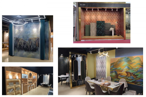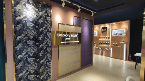 走进展厅,一抬眼便能看到奢宝丽三个大字熠熠生辉,搭配紫色艺术与北欧风情墙布,简单中蕴含非凡品味。