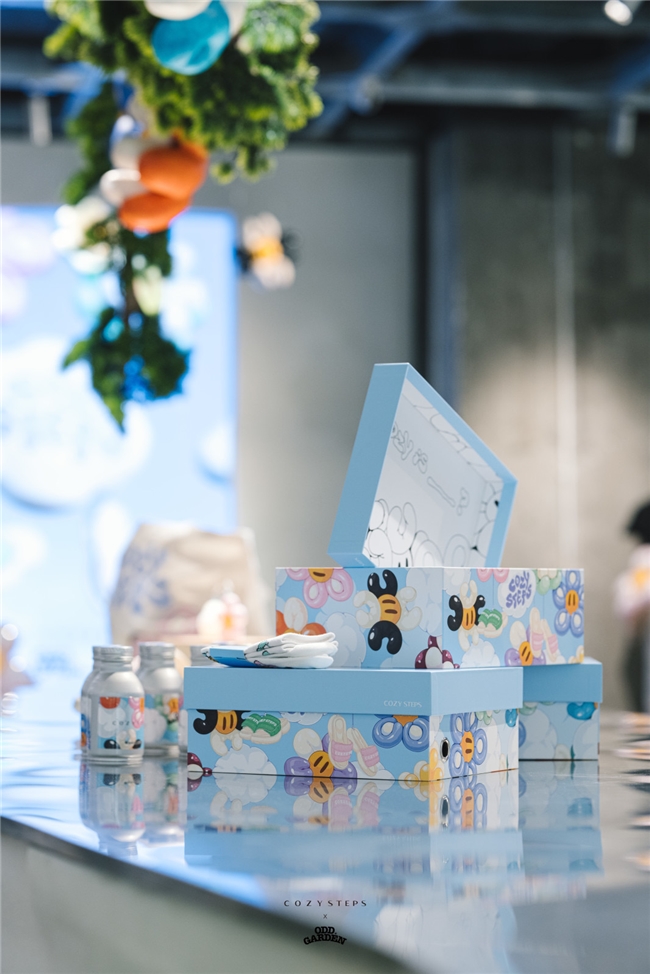 活动现场除了展示多款COZY STEPS的夏季新品外,与ODD GARDEN联名企划的限定产品也同样吸引了大家的诸多目光。从有趣的贴纸、日常生活必需的T恤、袜子、托特包到为生活带来情调的香薰蜡烛,联名产品带来的不仅仅是新奇的花色和样式,更是对生活态度的新定义,小小的物件也能体现出本次企划想表达的意义,为此次活动锦上添花。值得留意的是,本次联名企划的细致程度体现在众多有趣的小细节上,如嘭嘭鞋包装盒也通过特别改造,让人们能通过各种细节获得更好的嘭(pēng)然心动体验。