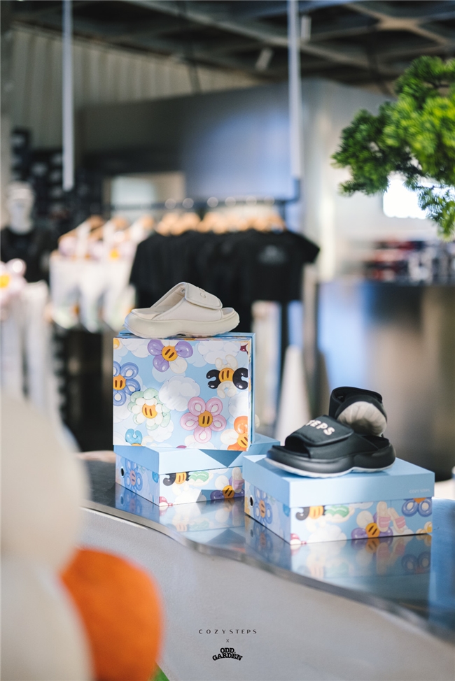 COZY STEPS,以舒适性为核心设计理念,始终追寻松弛城市生活态度的品牌理念,希望为繁忙的都市人提供舒适穿着。而ODD GARDEN奇妙花园,由艺术家JoeNg主导创立,通过幽默、童趣和可爱的手法探索人与自然之间的共生关系。在这样一个活力四射的夏日里,这场联名企划活动结合了两个品牌的初心,共同定格美好,将夏日「嘭(pēng)然心动」的美好完美展现。