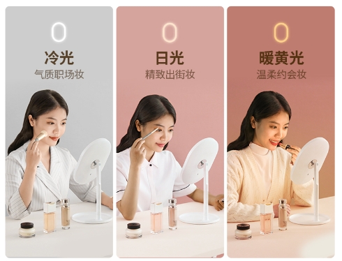 在光线色温方面,这款美妆镜拥有日光、冷光和暖黄光三种模式,可模拟户外、办公室及室内等不同的光线效果,用户可根据具体场合需求进行光效调节,化出更合适的妆容。