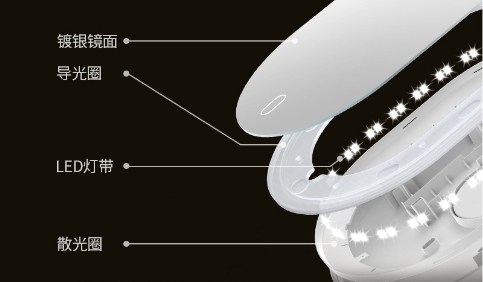 核心配置上,这款美妆镜采用微米级环形导光圈,内置52颗高清LED灯珠,实现3D立体的光源效果,使补光更加均匀。