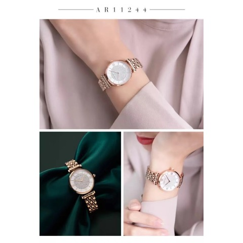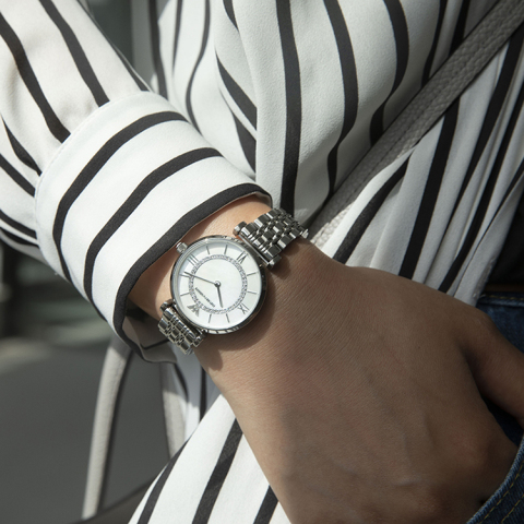 阿玛尼手表品类中最受欢迎的莫属于佟丽娅同款爆品满天星,对于甜美、女神范的女生来说最适合不过。玫瑰金表壳装饰间金表带,表盘上星空般的水晶点缀,优雅气质如圣洁般璀璨动人,以白色圆领衬衫、黑色半身裙,再搭配一双同色系高跟鞋,一副高雅禁欲女神的气息迎面而来。