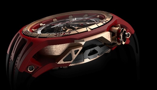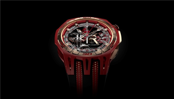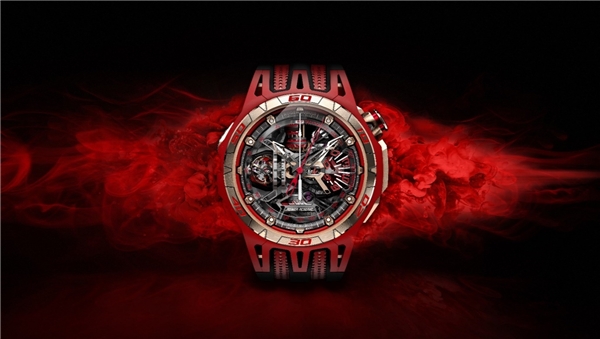 热情洋溢的红与玫瑰金相映成辉,同时搭配覆有黑色与灰色涂层的钛合金及碳纤维元素。极简主义风格的按钮与上链机制也采用了低调的隐藏式设计,愈显简约时尚。