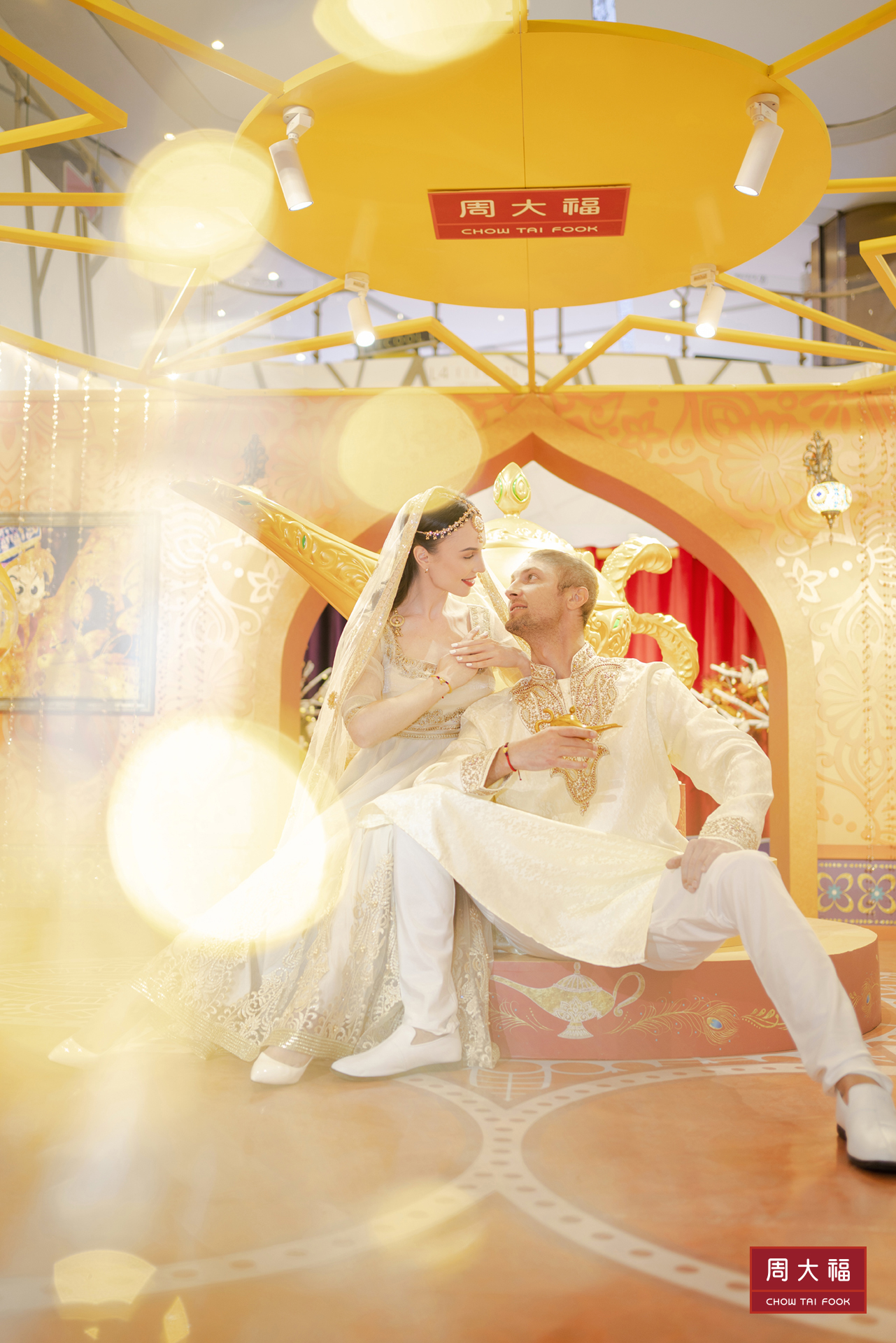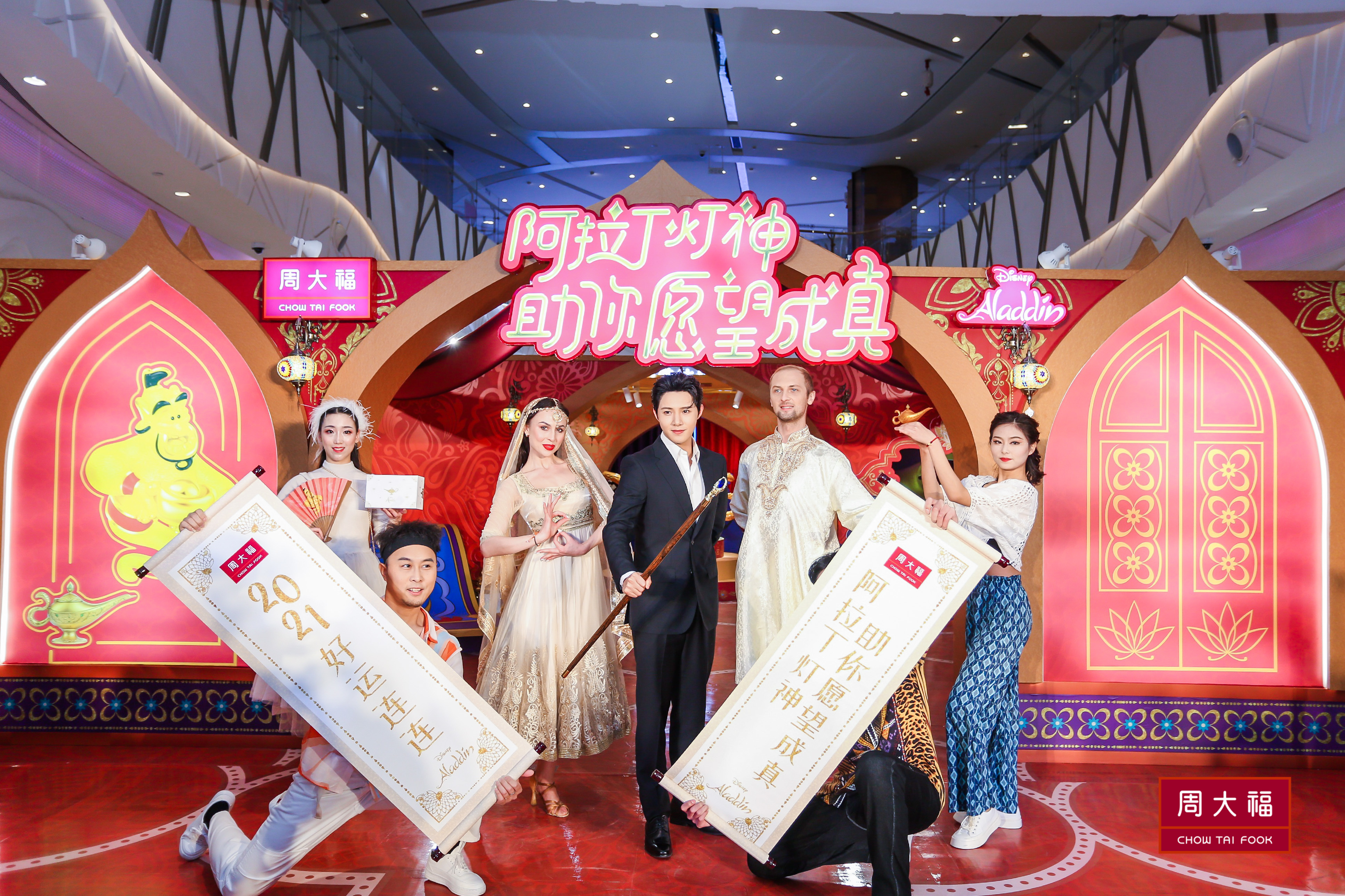 迪士尼动画《阿拉丁》男主角阿拉丁和猴子朋友阿布拥有一条神奇的魔法飞毡,偶遇偷跑出皇宫体验生活的茉莉公主,两人一见倾心,在神灯精灵的帮助下,帮助许愿者愿望成真。后来阿拉丁识破邪恶势力的诡计,战胜邪恶,拿回神灯,与茉莉公主终成眷属。本次周大福迪士尼系列阿拉丁灯神新品发布的展区就依据《阿拉丁》的故事设定,划分为【潮绎飞毯区】、【淘金许愿区】与【愿望成真区】,穿越过灯神之门,走上人生巅峰,在【潮绎飞毯区】抽取签文,坐上魔幻飞毯,一起预见2021的幸运;在展区中间,观览者可以在被魔法珠帘包围的【淘金许愿区】面对神灯,许下自己的愿望并在完成一个小互动之后,在【愿望成真区】获得愿望牌,承载心愿后放入愿望墙,获得幸运灯神的祝福。